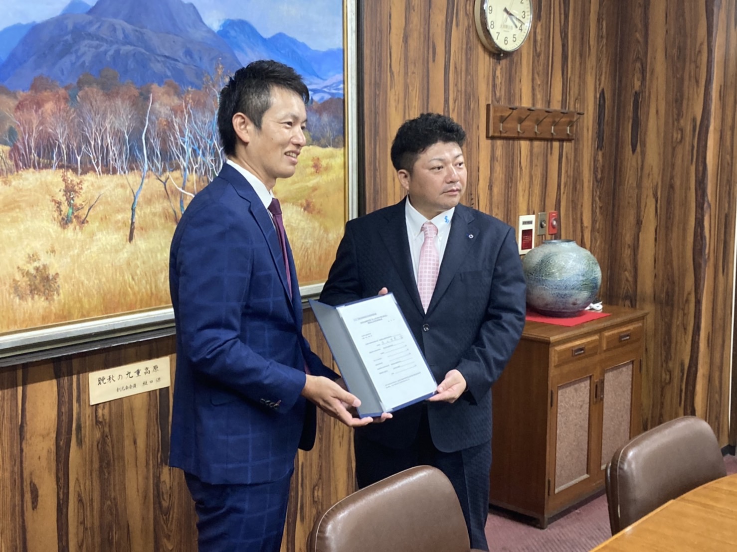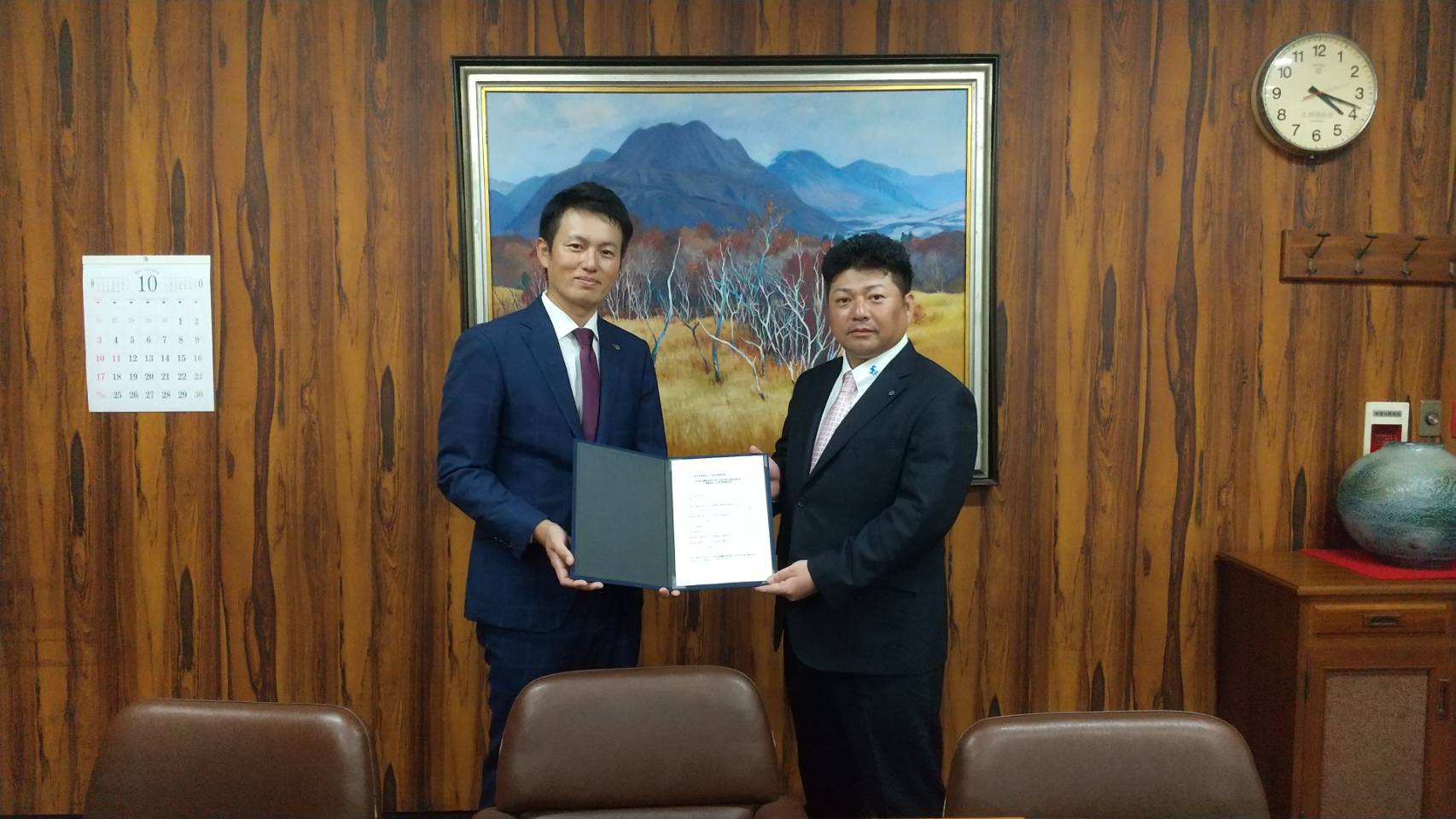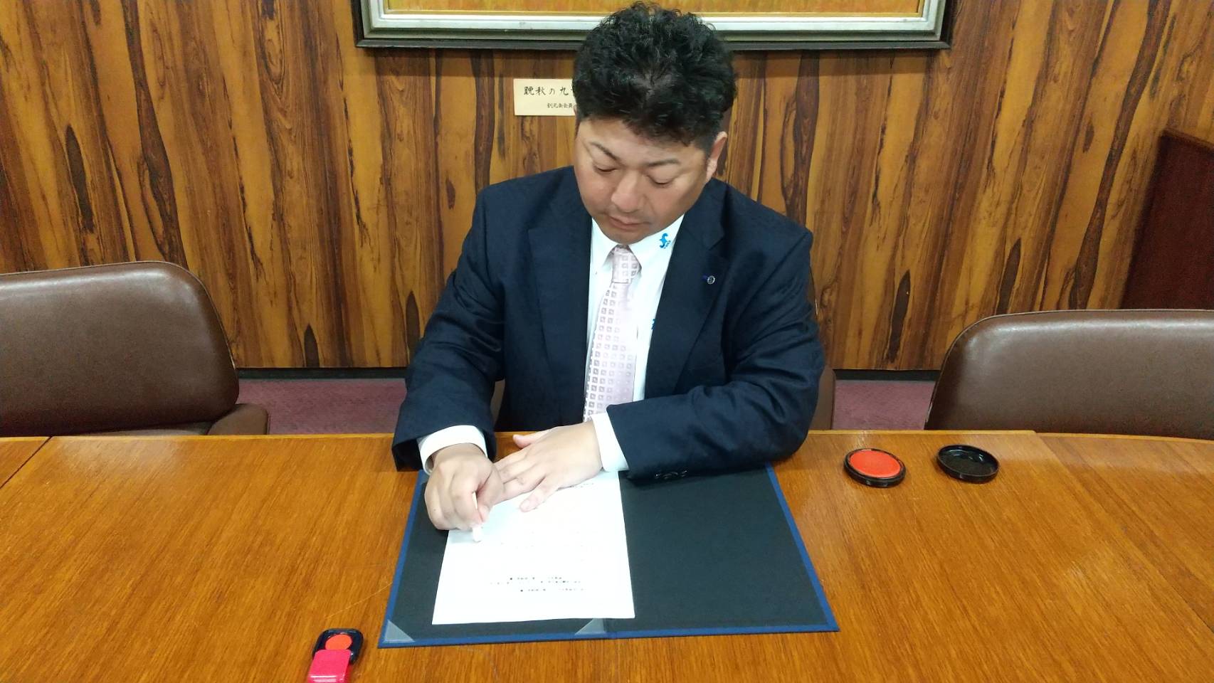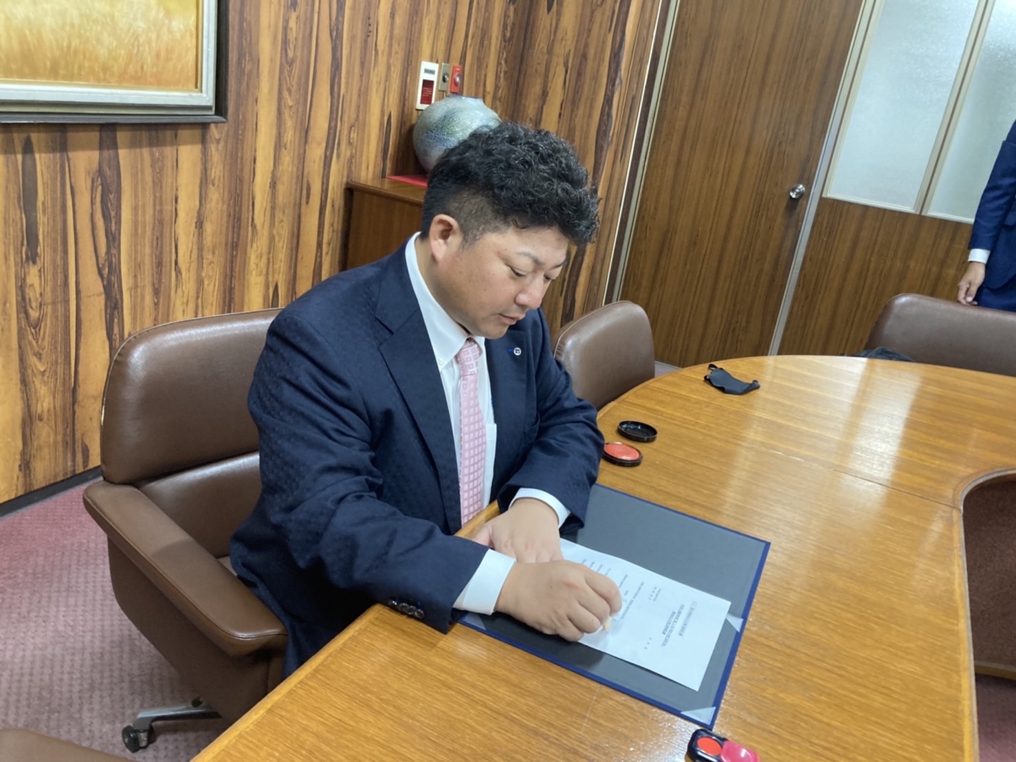 令和3年10月8日(金)16時より、日本商工会議所青年部「第44回(令和6年度)全国大会」の開催地および主管立候補届出書の、主管商工会議所青年部連合会として、福岡県商工会議所青年部連合会 令和3年度井上会長に署名&捺印をしていただきました。
