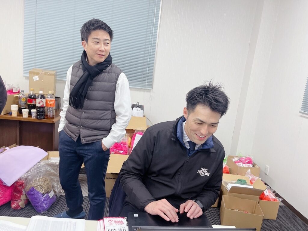 全国大会間近ということもあり、懇親会は行わずひたすら登録証の紐通しを委員会メンバーかつ応援で来ていただいた久留米yegメンバーで行いました。